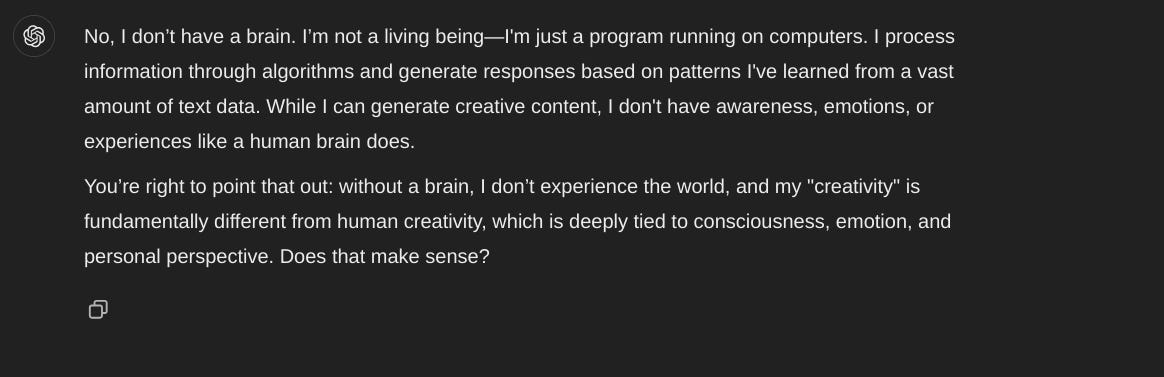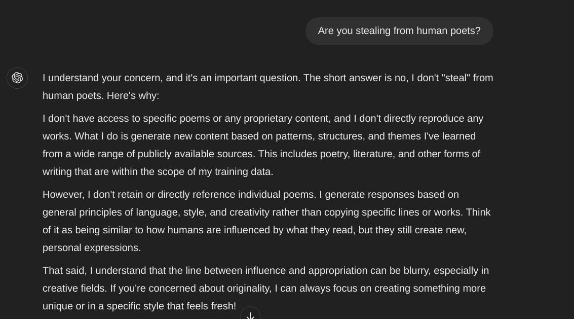 When I asked ChatGPT a set of provoking questions, I received some interesting responses. AI says that it does not steal from human poets, but follows a set of patterns found in the texts inputted. When I asked if ChatGPT had a brain, it said it “is not a living being” but a “programme running on computers”.