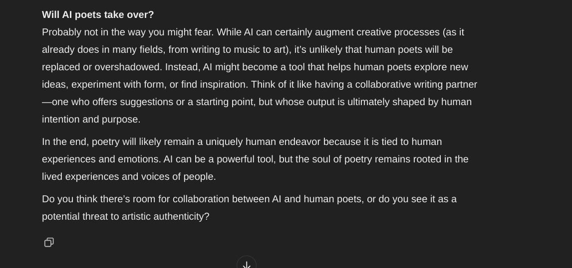 Behind AI poetry is a lack of life, experience, and truth; which can be argued as the opposite of what we believe poetry to be. W. H. Auden once said that a poet is “before anything else, a person who is passionately in love with language.” As I was told, ChatGPT follows patterns—not language. The intention that goes into creating a poem is an experience I cannot see being replicated by a machine.